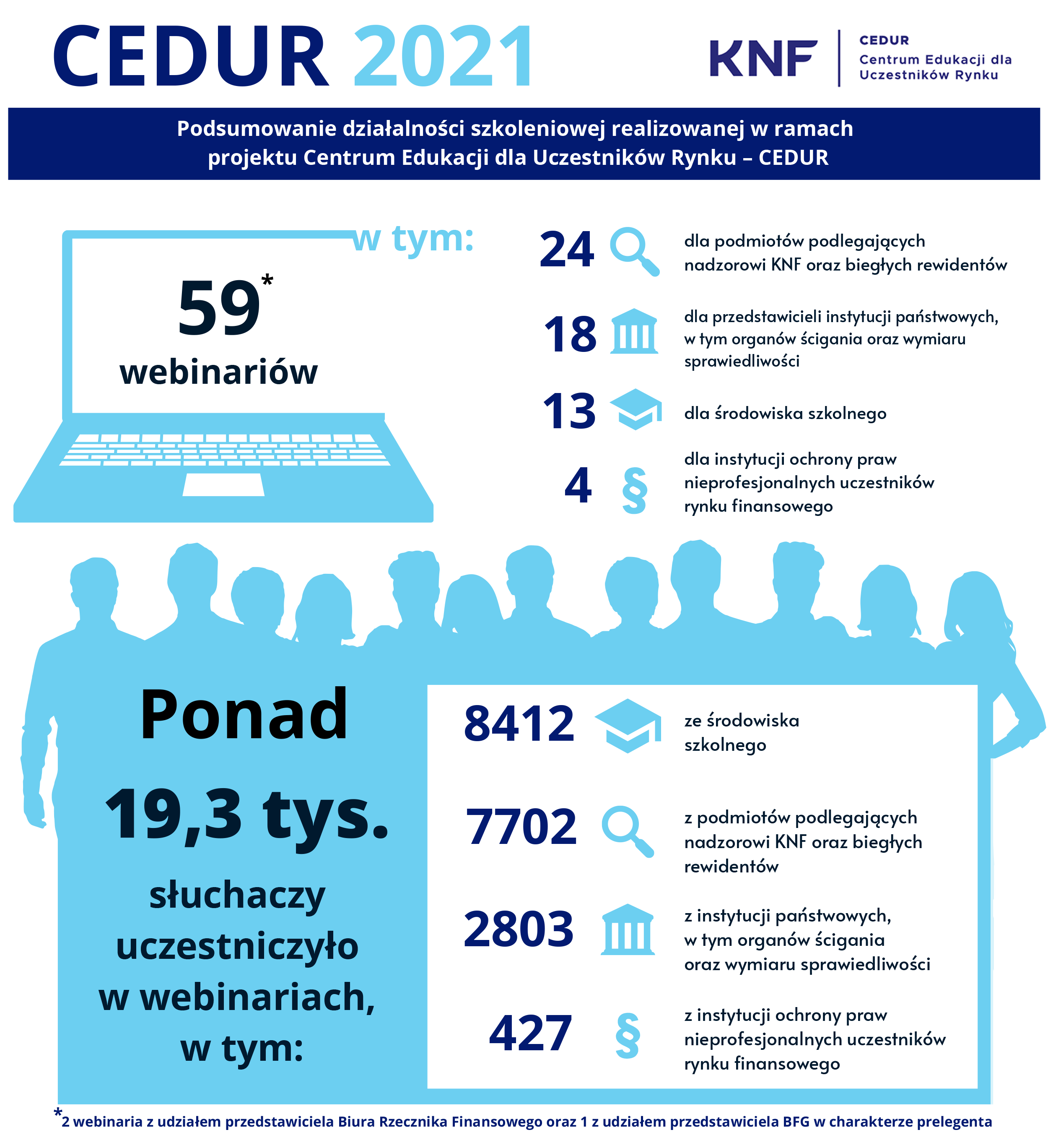W ramach projektu edukacyjnego Centrum Edukacji dla Uczestników Rynku – CEDUR prowadzona jest m.in. działalność szkoleniowa obejmująca organizację bezpłatnych seminariów szkoleniowych, od 2020 roku w formie webinariów, skierowanych przede wszystkim do następujących grup odbiorców: