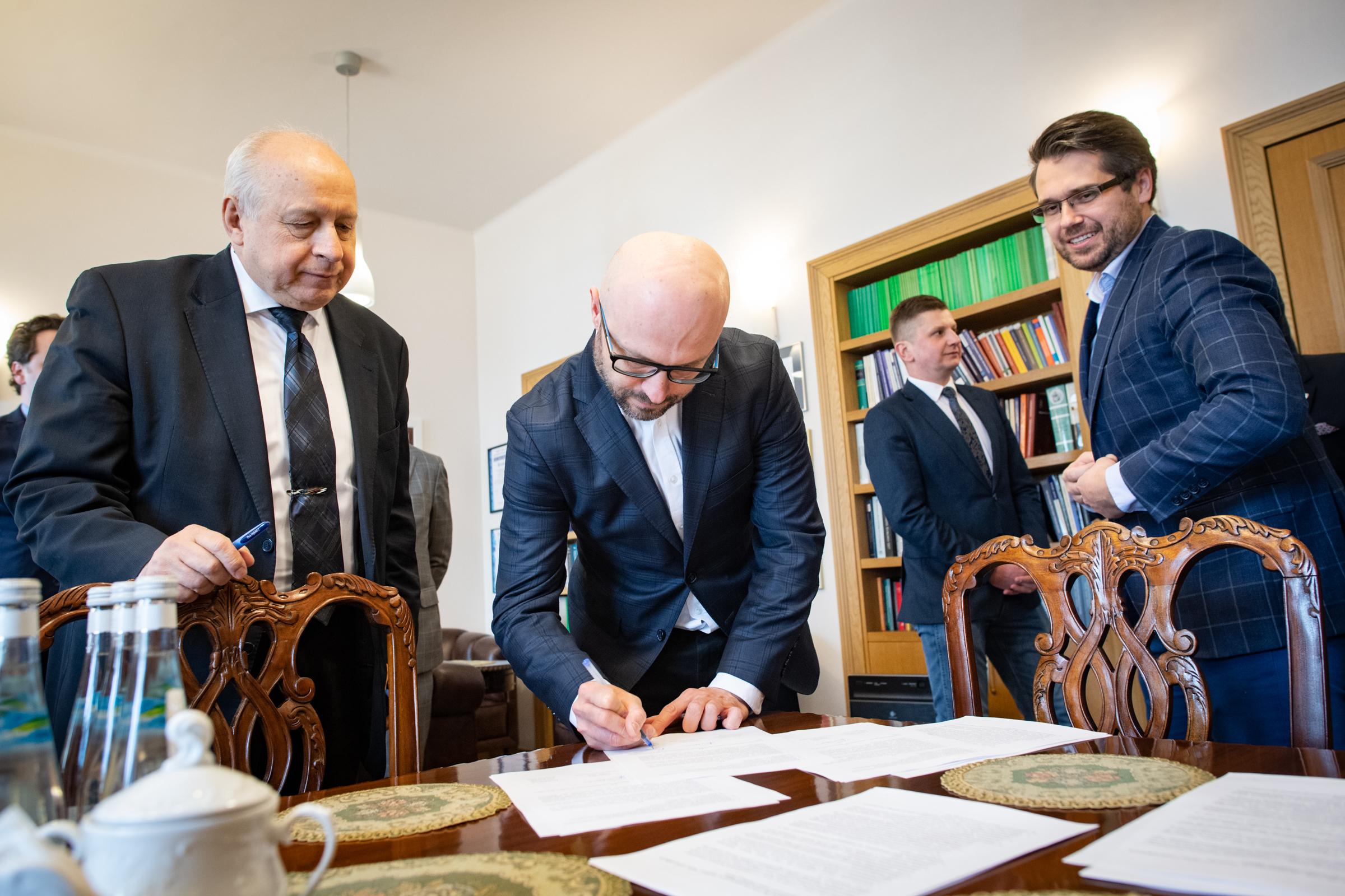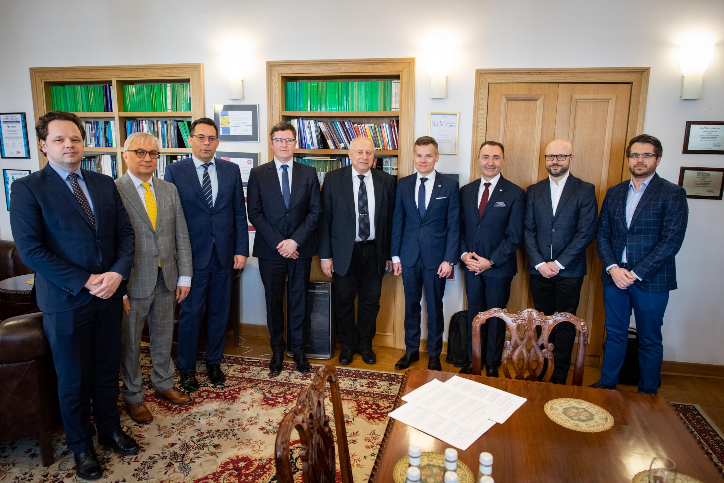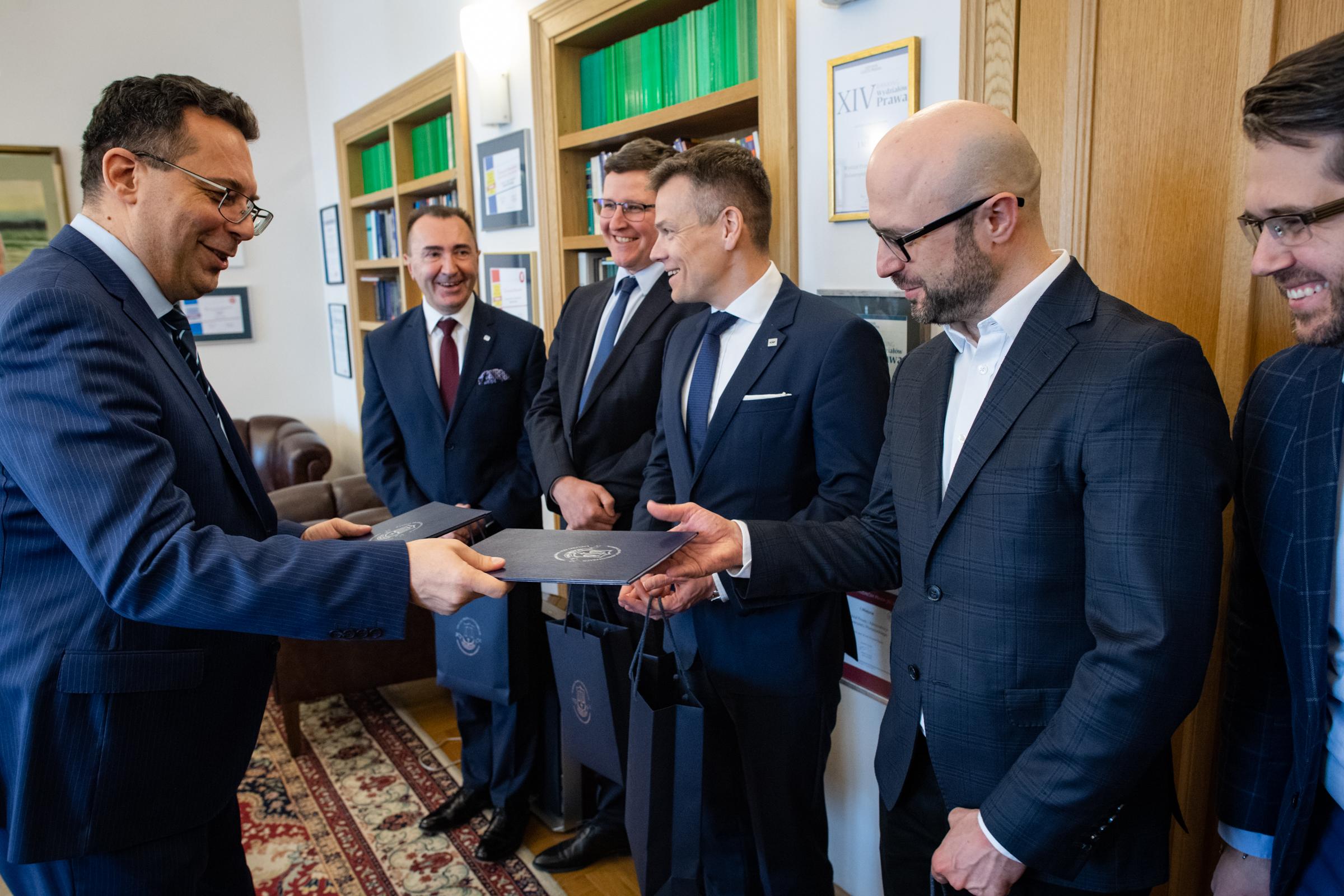 Prof. Tomasz Giaro, Dziekan Wydziału Prawa i Administracji Uniwersytetu Warszawskiego, dr Paweł Widawski – Prezes oraz Piotr Brewiński – Wiceprezes zarządu Fundacji na Rzecz Innowacji Finansowych FinTech Polska, a także dr Kamil Mroczka, Dyrektor Generalny Urzędu Komisji Nadzoru Finansowego, zawarli Porozumienie w sprawie wspólnego przedsięwzięcia edukacyjnego. Po stronie UKNF w spotkaniu wzięli również udział dr hab. Jacek Jastrzębski, prof. UW – Przewodniczący Komisji Nadzoru Finansowego, Jacek Barszczewski – Dyrektor Departamentu Komunikacji Społecznej oraz Zbigniew Jacek Wiliński – Dyrektor Departamentu Innowacji Finansowych FinTech.