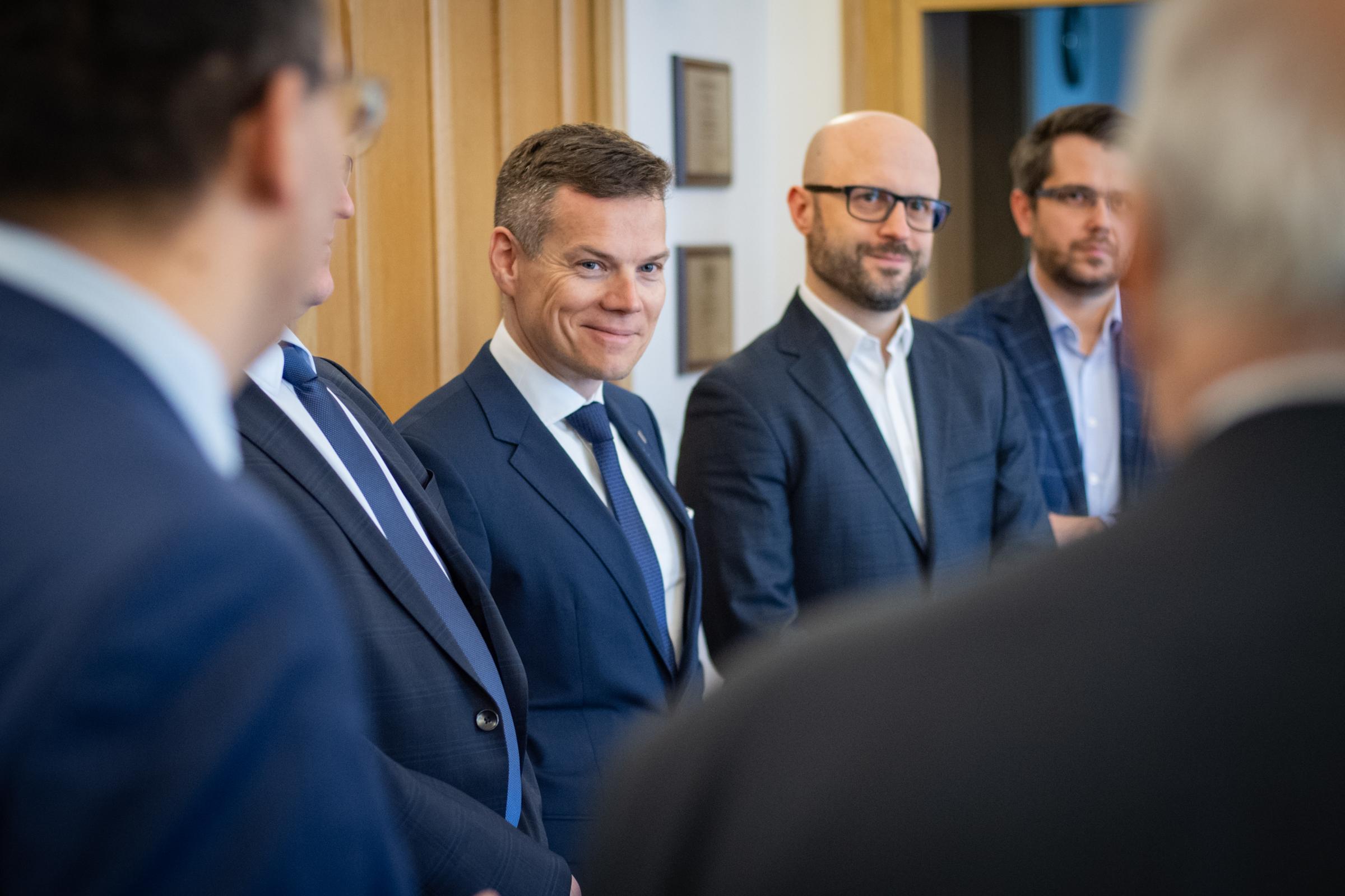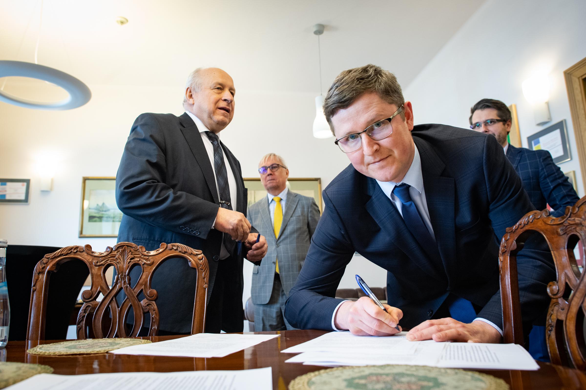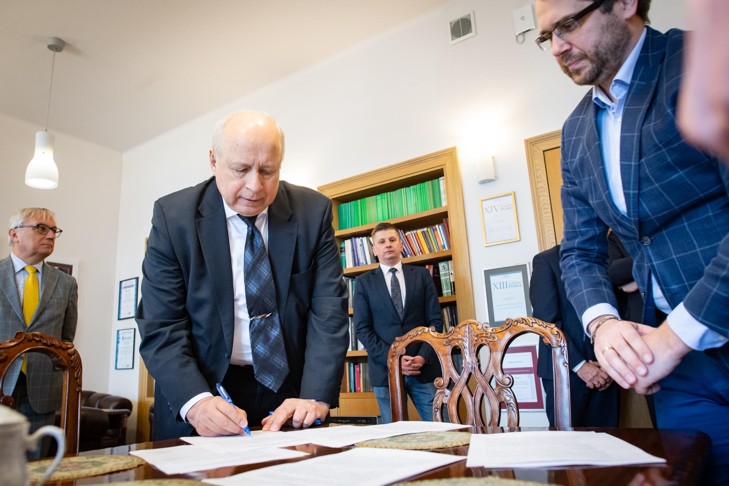Prof. Tomasz Giaro, Dziekan Wydziału Prawa i Administracji Uniwersytetu Warszawskiego, dr Paweł Widawski – Prezes oraz Piotr Brewiński – Wiceprezes zarządu Fundacji na Rzecz Innowacji Finansowych FinTech Polska, a także dr Kamil Mroczka, Dyrektor Generalny Urzędu Komisji Nadzoru Finansowego, zawarli Porozumienie w sprawie wspólnego przedsięwzięcia edukacyjnego. Po stronie UKNF w spotkaniu wzięli również udział dr hab. Jacek Jastrzębski, prof. UW – Przewodniczący Komisji Nadzoru Finansowego, Jacek Barszczewski – Dyrektor Departamentu Komunikacji Społecznej oraz Zbigniew Jacek Wiliński – Dyrektor Departamentu Innowacji Finansowych FinTech.