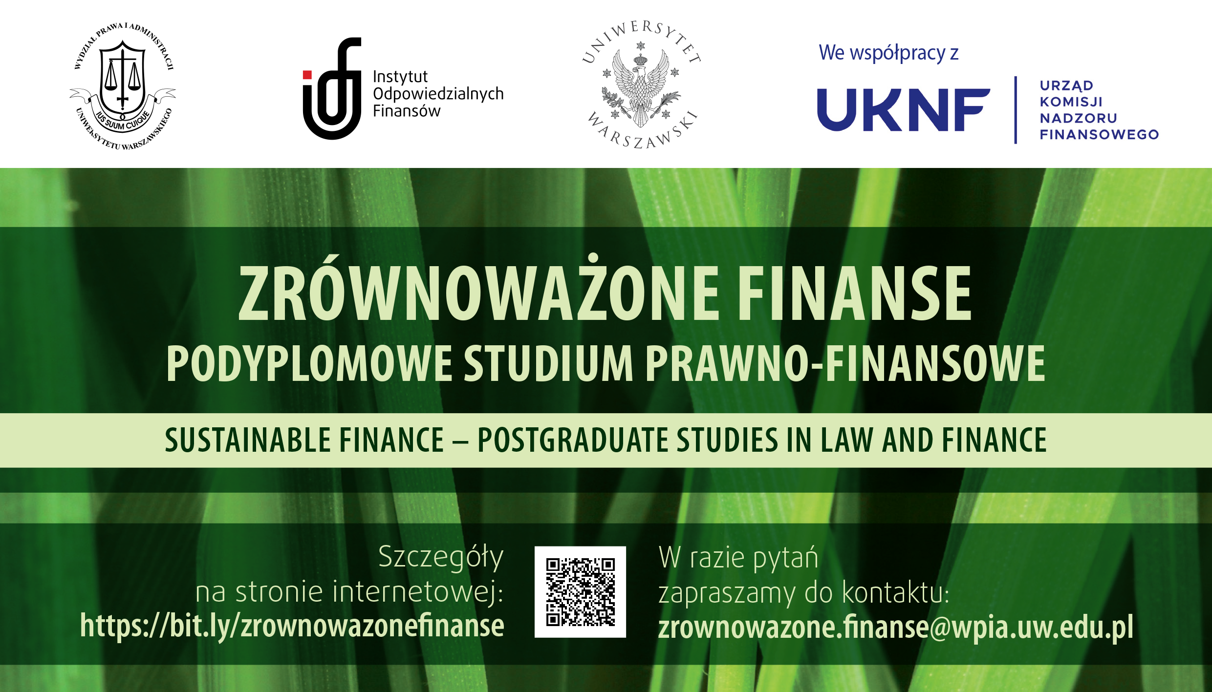 Uniwersytet Warszawski we współpracy z UKNF zaprasza na podyplomowe studium poświęcone problematyce oddziaływania czynników klimatycznych i środowiskowych na sektor finansowy i budżetowanie publiczne. Celem studium jest kompleksowe przedstawienie problematyki zrównoważonych finansów, zarówno w wymiarze prawnym jak i finansowym. Program obejmuje zarówno wykłady o charakterze ogólnym, jak też zajęcia pomagające we wdrażaniu rozwiązań z obszaru zrównoważonych finansów.