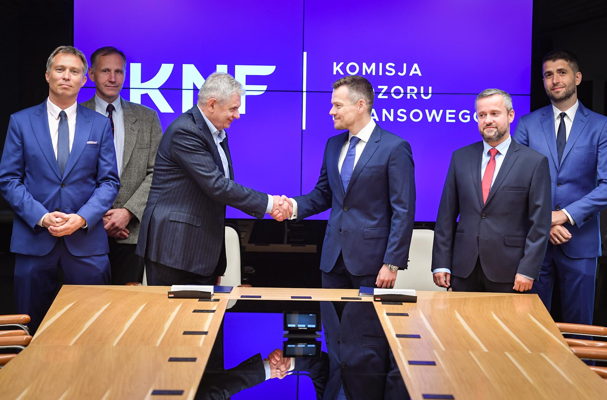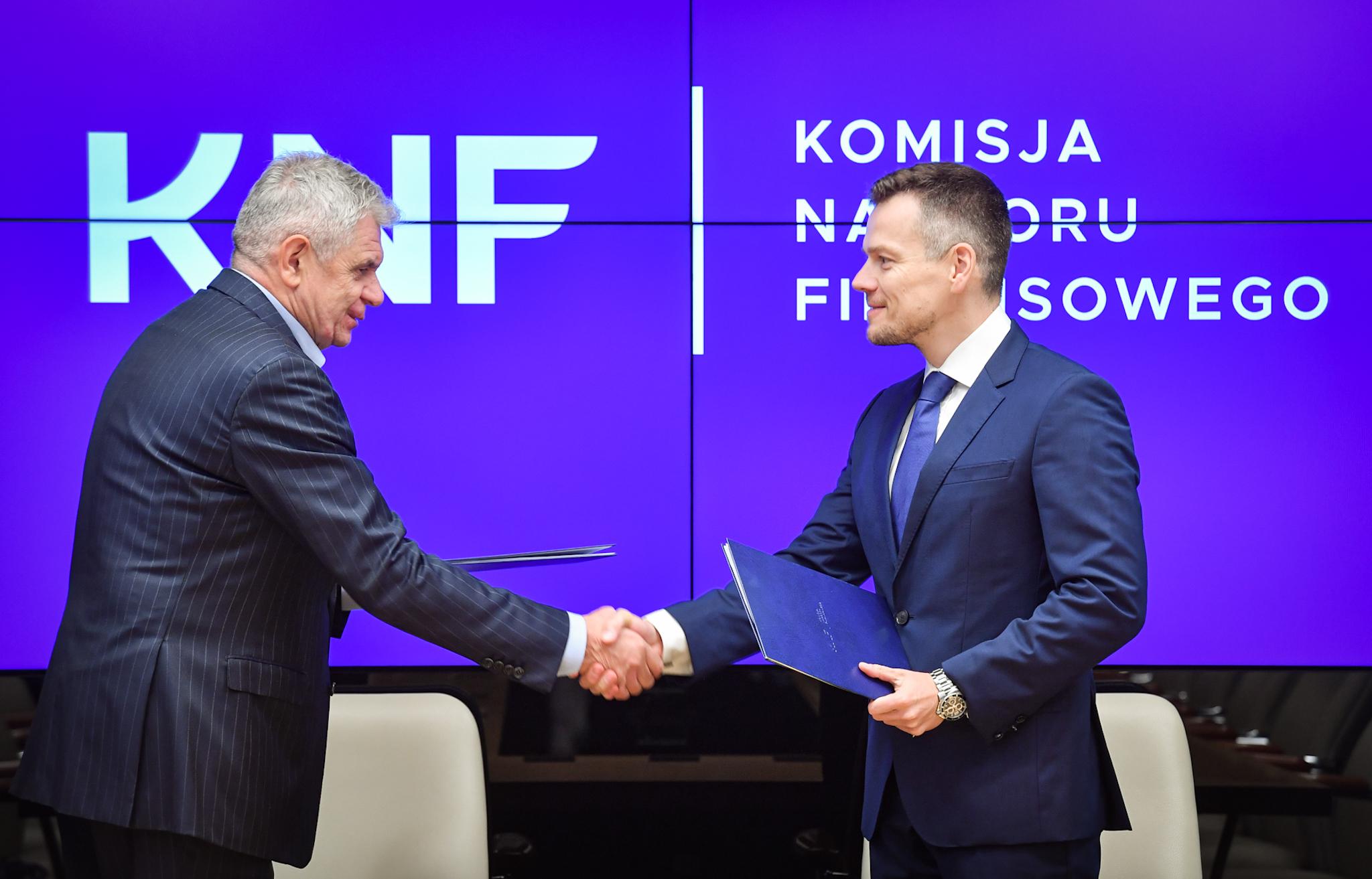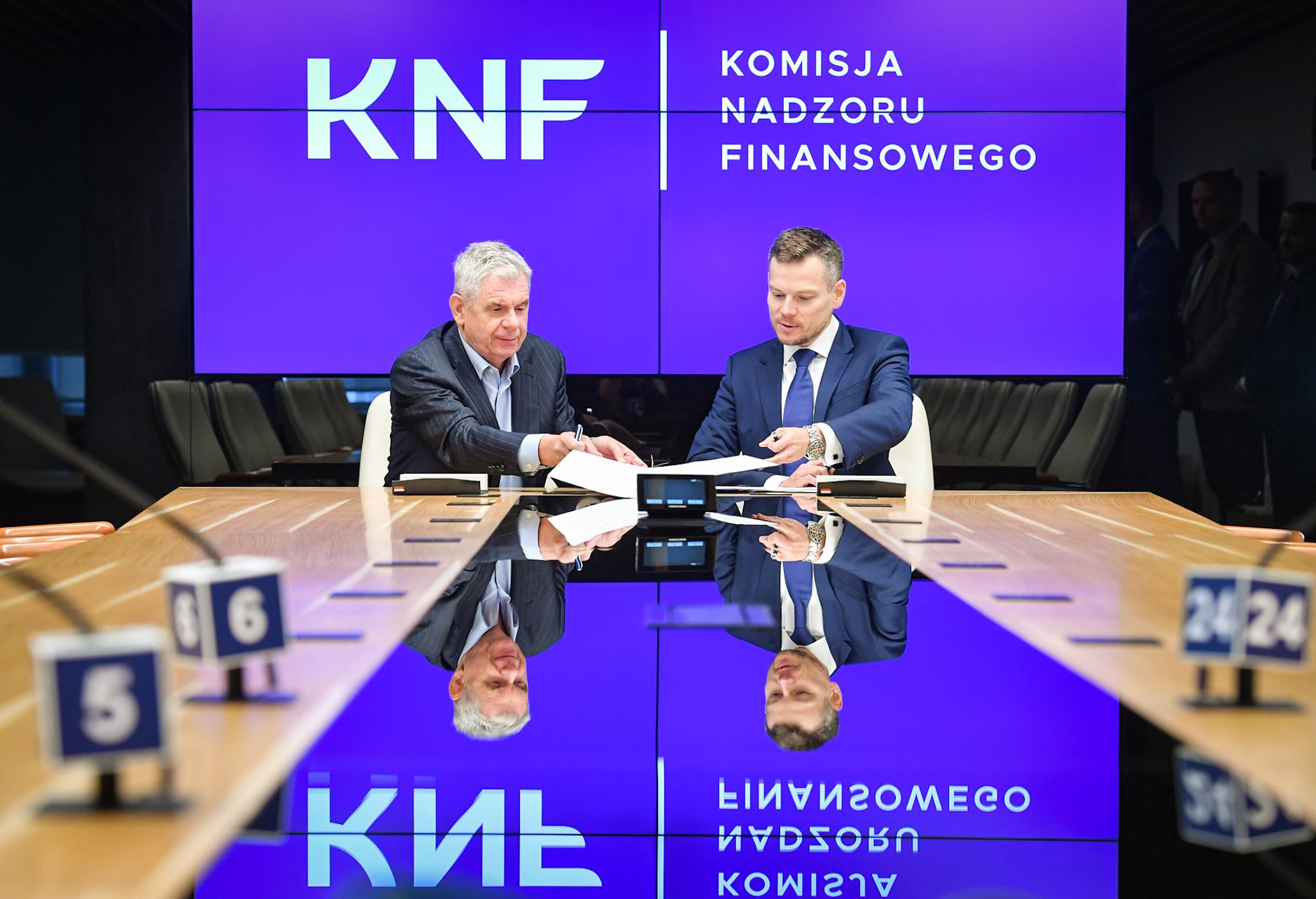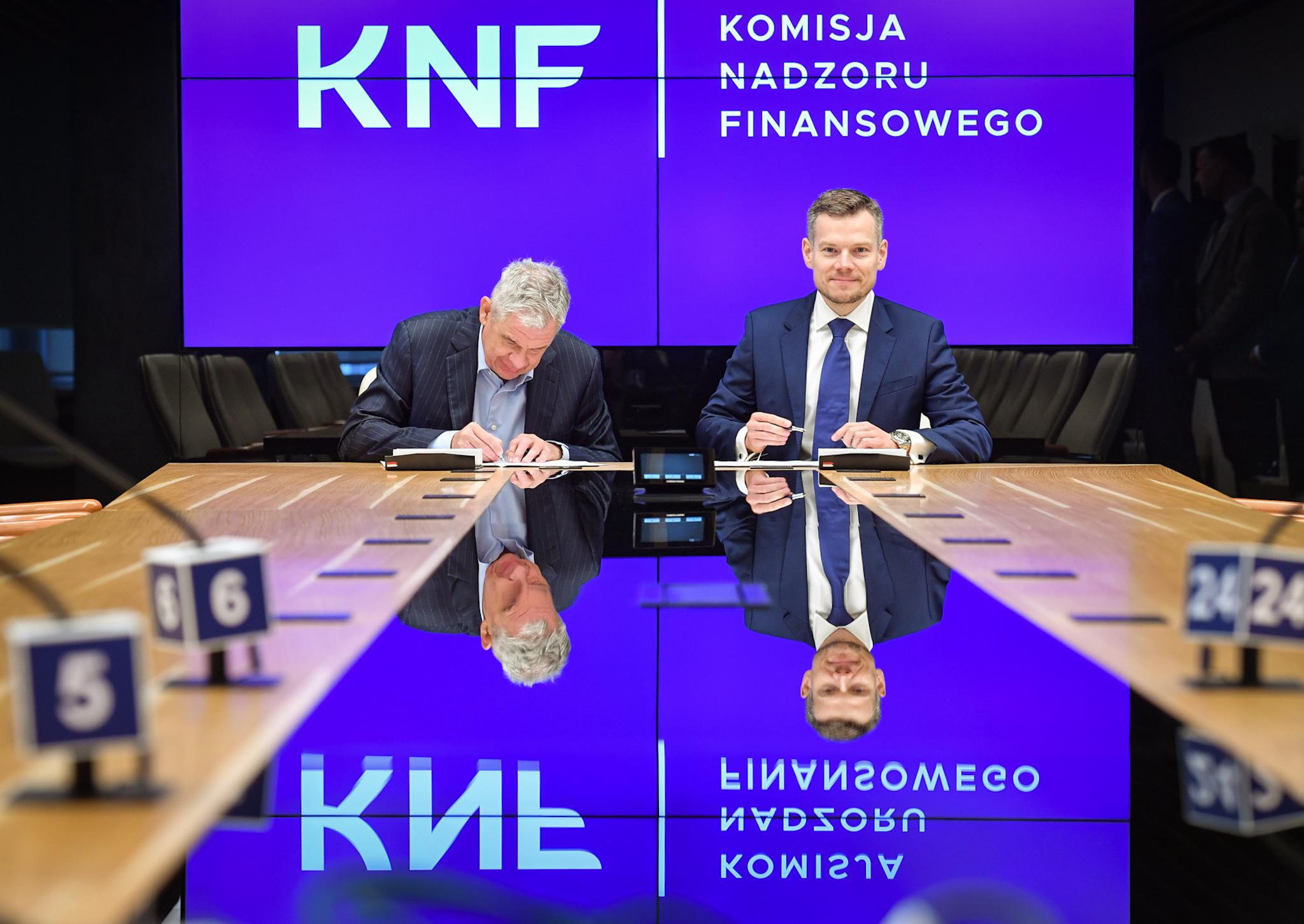 Jacek Jastrzębski, Przewodniczący Komisji Nadzoru Finansowego i Jacek Oko, Prezes Urzędu Komunikacji Elektronicznej, podpisali umowę o współpracy między kierowanymi przez siebie instytucjami.