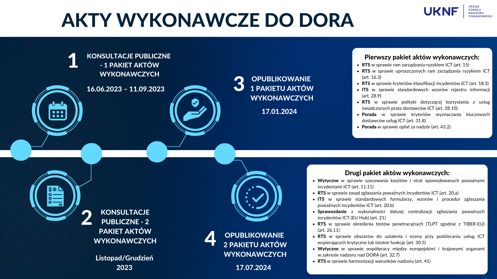 1 pakiet aktów wykonawczych do DORA oraz informacje o konsultacjach publicznych, w tym rejestracja na wysłuchanie, dostępne są m.in. na stronie EBA: https://www.eba.europa.eu/esas-consult-first-batch-dora-policy-products.