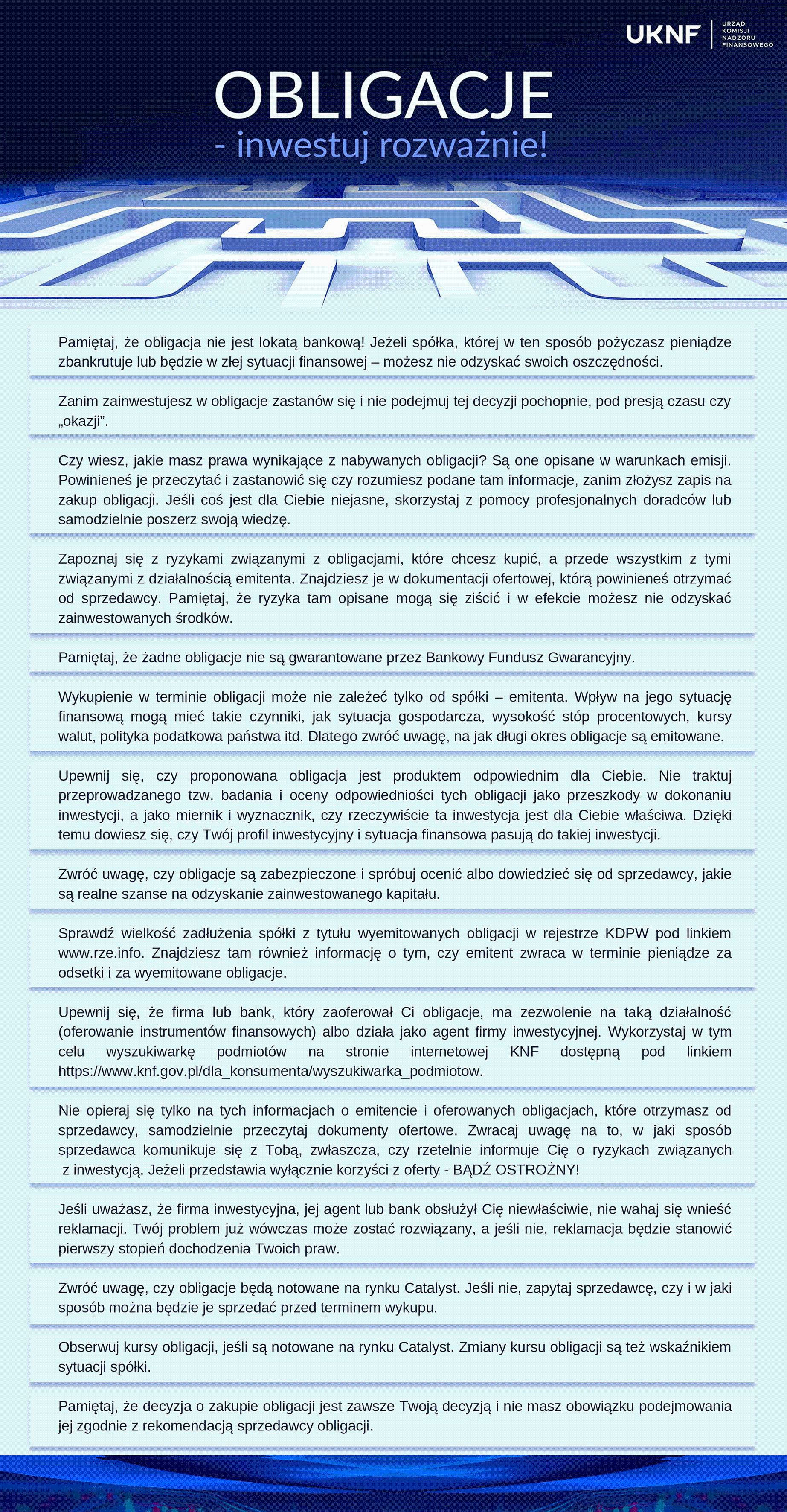 Nakładem Urzędu Komisji Nadzoru Finansowego została wydana publikacja edukacyjna „Prawa obligatariusza - poradnik dla nieprofesjonalnych uczestników rynku finansowego". Osoby zainteresowane inwestowaniem w obligacje zachęcamy do zapoznania się z przygotowanymi materiałami edukacyjnymi - publikacją oraz elektroniczną ulotką informacyjną „Obligacje – inwestuj rozważnie!”.