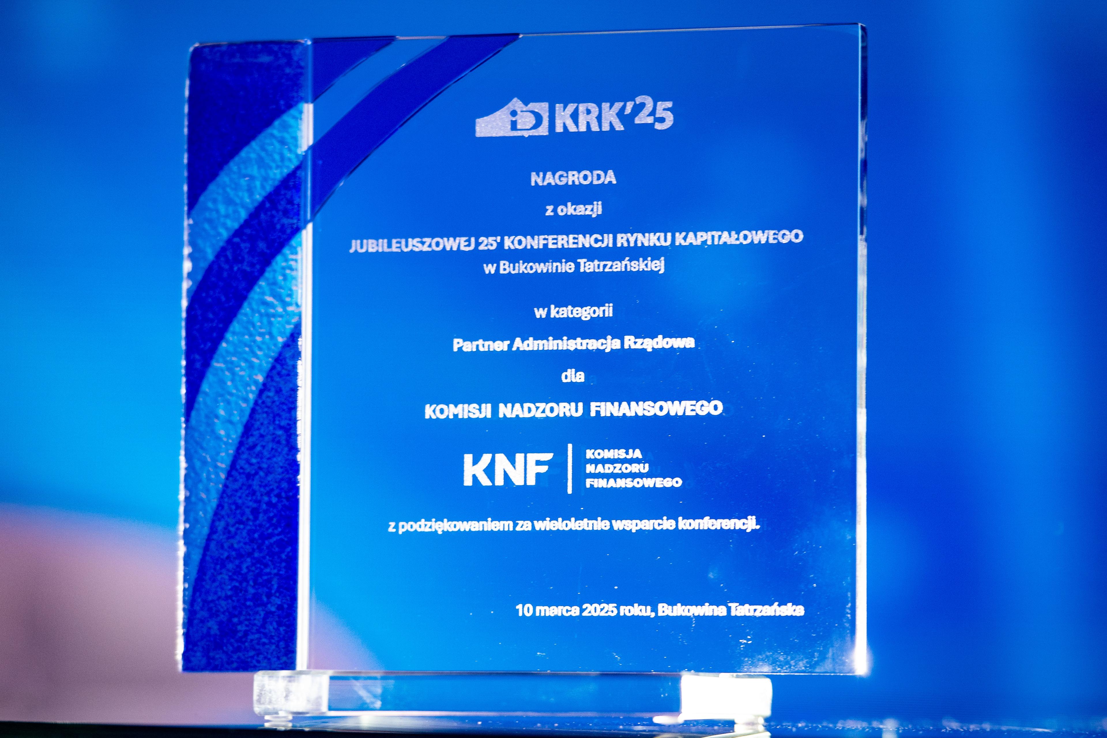 Komisja Nadzoru Finansowego otrzymała nagrodę Izby Domów Maklerskich z okazji 25. Jubileuszowej Konferencji Rynku Kapitałowego „za wieloletnie wsparcie konferencji”.