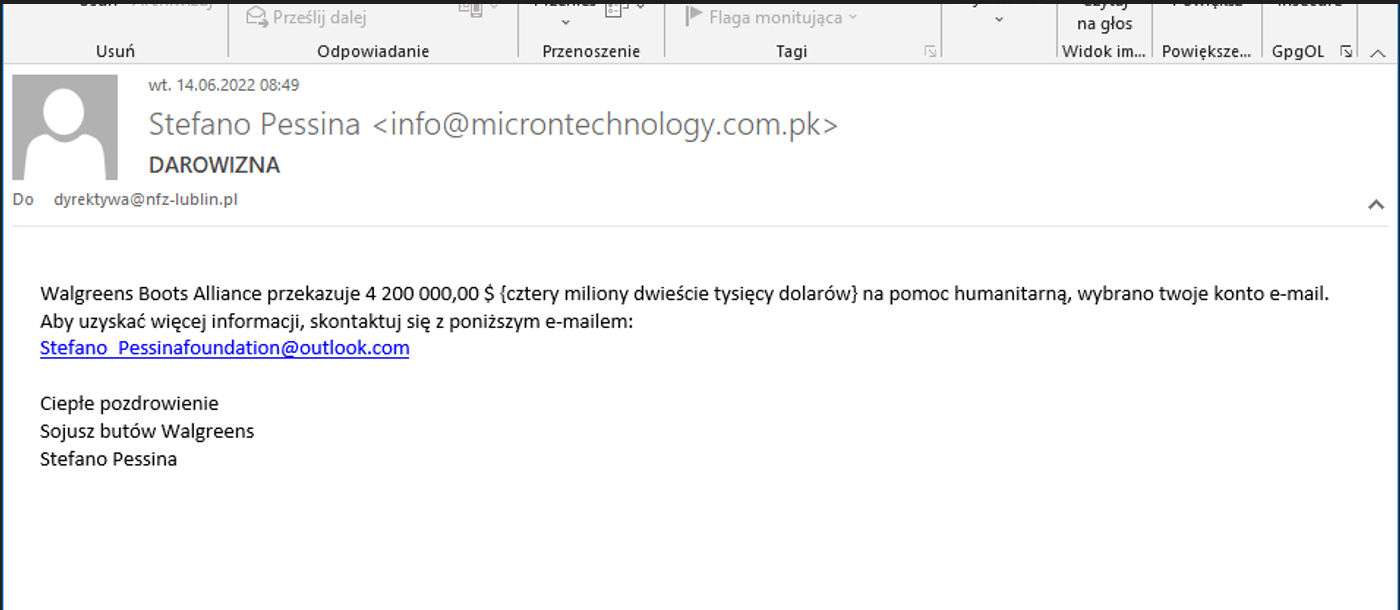 Przykład wiadomości e-mail wysłanej przez oszustów