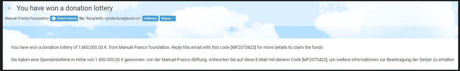 [Krok 1] Oszustwo rozpoczyna się od wysłania e-maila do wybranej osoby, np. z informacją, że otrzymała ona rzekomy spadek, darowiznę lub została wylosowana jako zwycięzca w narodowej loterii któregoś z europejskich państw.