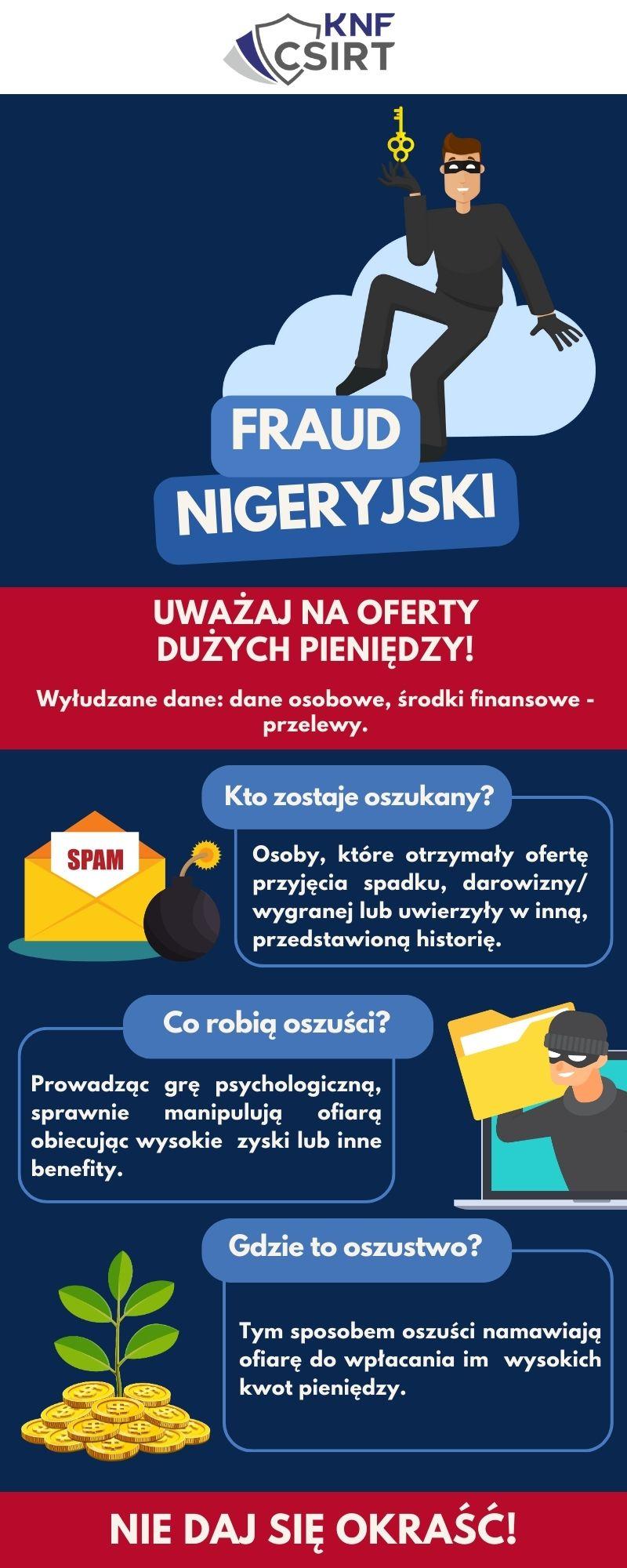 Oszustwo znane jako „fraud nigeryjski” polega na wciągnięciu przypadkowej lub wytypowanej osoby w grę psychologiczną pod pozorem fikcyjnego przekazania jej bardzo dużych pieniędzy z zagranicy, najczęściej z krajów afrykańskich, a w rzeczywistości mające na celu wyłudzenie pieniędzy właśnie od niej.