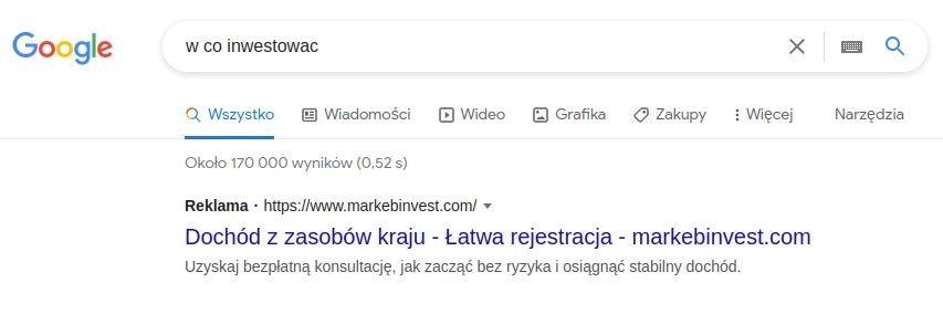- szczególną uwagę zwróć na pojawiający się przy wynikach wyszukiwania pogrubiony napis „reklama” – może to świadczyć o tym, że strona jest niebezpieczna i została stworzona przez oszustów,