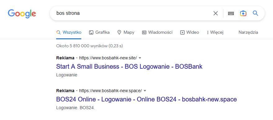 Przykłady reklam pojawiających się w wynikach wyszukiwania po wpisaniu frazy związanej z inwestowaniem oraz BOŚ Bank