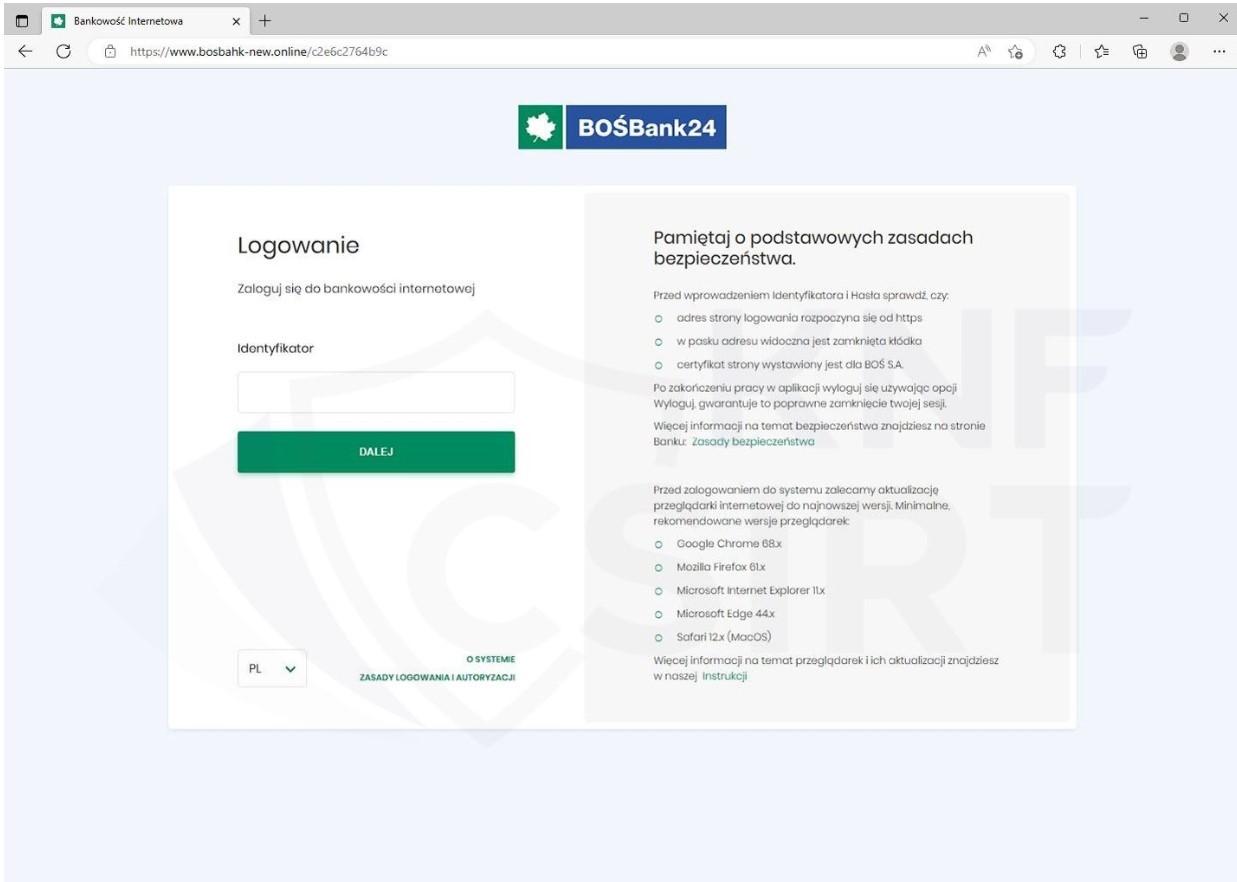 "Fałszywa" strona BOŚ Bank, stworzona przez cyberoszustów w celu wyłudzania poświadczeń logowania do bankowości internetowej lub elektornicznej