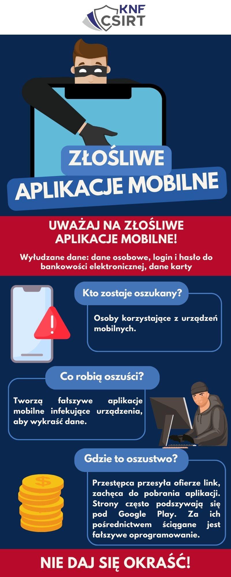 Oszuści wysyłają wiadomości z informacją, że konieczne jest pobranie aplikacji do wykonania dalszych czynności. Na potrzeby swoich działań mogą tworzyć strony phishingowe łudząco podobne do stron internetowych oficjalnych sklepów z aplikacjami. Co ciekawe, oszuści mogą udostępniać „złośliwe" aplikacje również w oficjalnie działających sklepach, np. Google Play.