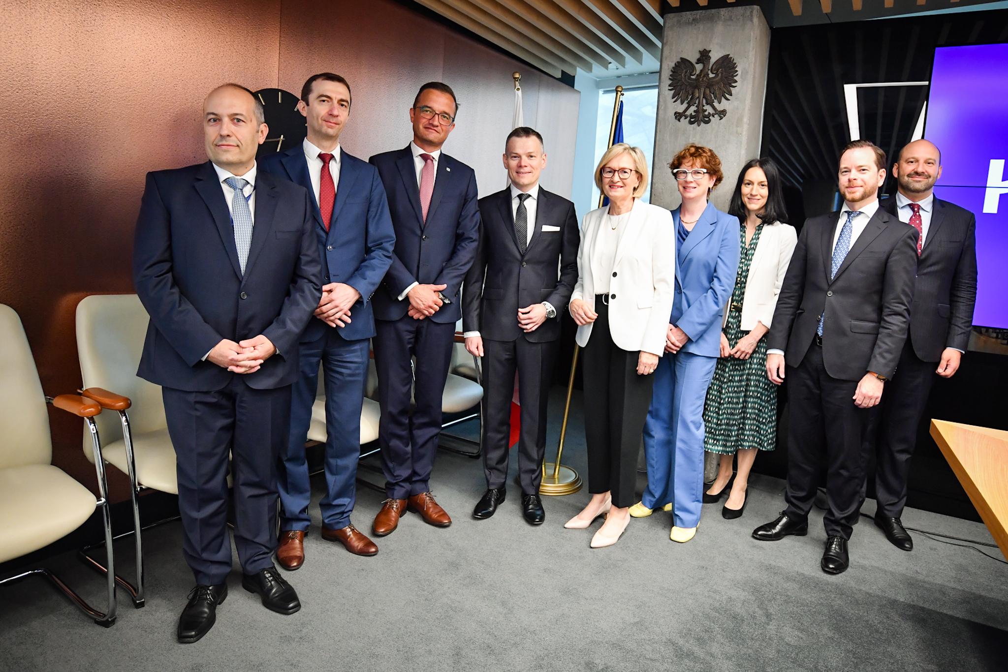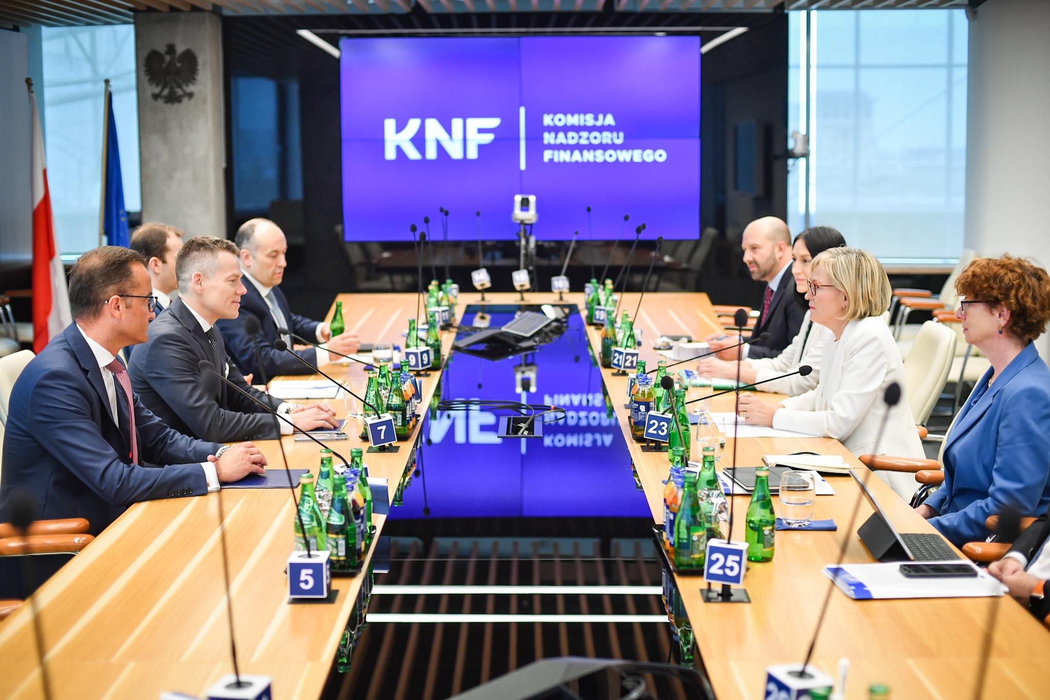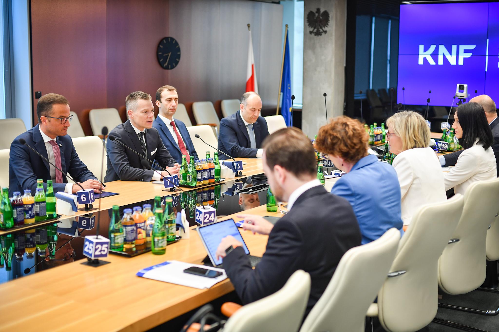 Jackowi Jastrzębskiemu podczas spotkania towarzyszyli Zastępcy Przewodniczącego KNF: Marcin Mikołajczyk oraz Krystian Wiercioch oraz Damian Jaworski – Dyrektor Departamentu Współpracy Międzynarodowej w Urzędzie KNF.