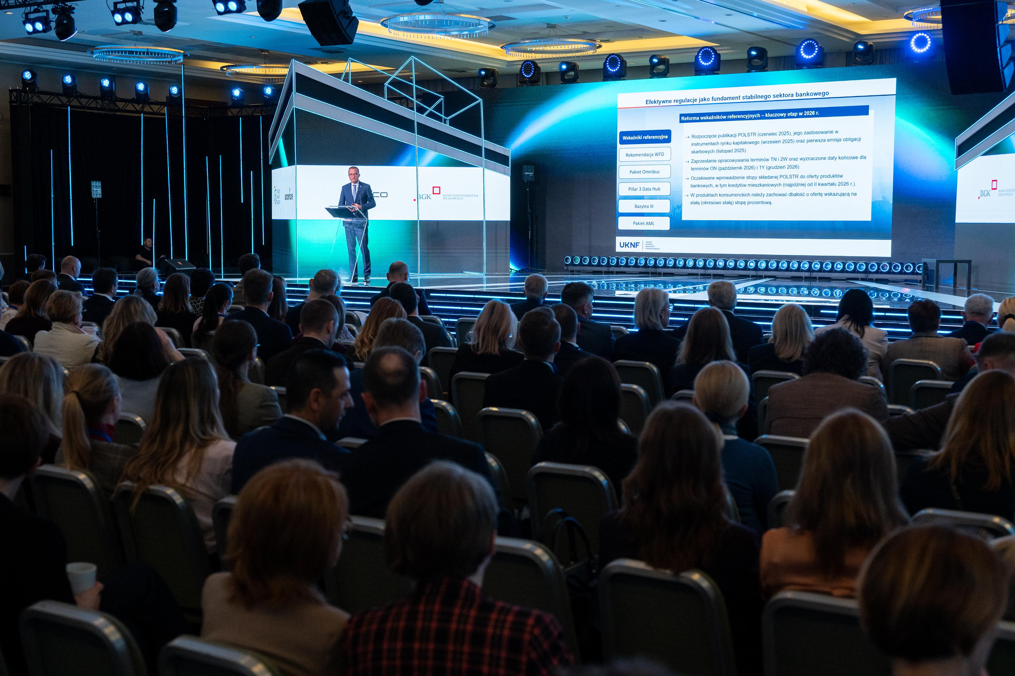Wśród zmian regulacyjnych Marcin Mikołajczyk wskazał na szczególne znaczenie reformy wskaźników referencyjnych, której kluczowym elementem jest wprowadzenie nowego wskaźnika POLSTR i stopniowe odchodzenie od WIBOR-u, zwłaszcza w produktach kierowanych do klientów detalicznych. Podkreślił, że sukces reformy zależy w dużej mierze od aktywności sektora bankowego, który jest głównym użytkownikiem wskaźników. Wspomniał również o wyroku Trybunału Sprawiedliwości Unii Europejskiej. Orzeczenie to pokazuje, że silne ramy regulacyjne mogą chronić system finansowy przed ryzykami prawnymi i wzmacniać zaufanie do rynku.