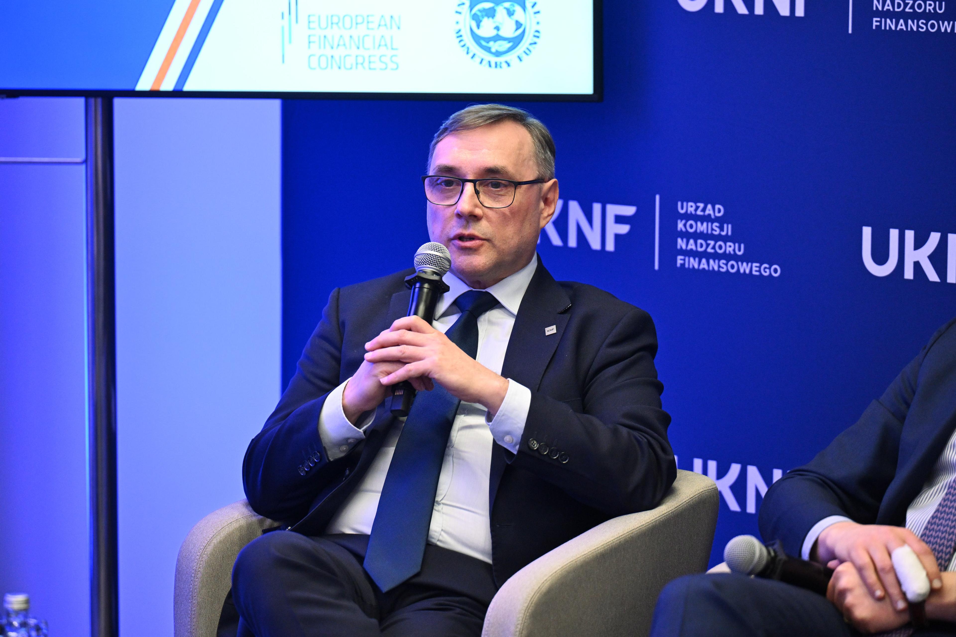 Podkreślił, że dla budowania fundamentów długoterminowego wzrostu korzystne byłoby, aby część tych środków bezpośrednio zasiliła gospodarkę poprzez rynek kapitałowy. W tym kontekście wskazał na kulturowo i historycznie uwarunkowaną niską skłonność polskich gospodarstw domowych do alokowania środków finansowych w instrumenty o większym ryzyku. Jednocześnie zauważył, że bodźce podatkowe i regulacyjne nie zawsze służą większemu zaangażowaniu inwestorów na rynku kapitałowym. Zakończył swoje wystąpienie stwierdzenie, że UKNF w ramach swojego mandatu prowadzi działania na rzecz rozwoju rynku finansowego. Urząd KNF będzie prowadził prace analityczne na rzecz identyfikacji działań, które rozwojowi tego rynku mogą służyć.