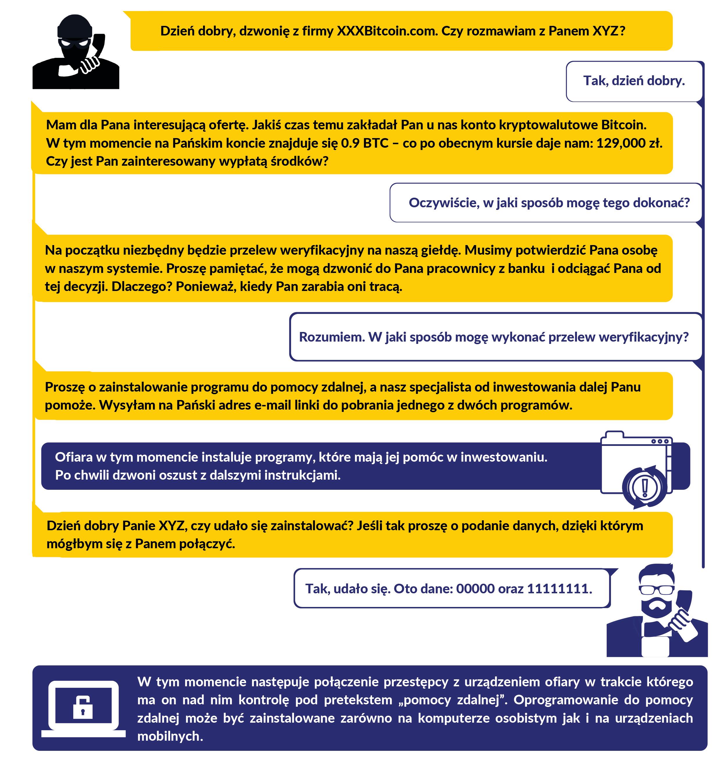 W dalszej części rozmowy ofiara proszona jest o zalogowanie się do banku i przesłanie umówionej kwoty weryfikacyjnej na wybraną przez przestępców legalnie działającą giełdę kryptowalut, gdzie ofiara przed ww. czynnościami musi odbyć weryfikację KYC (Know Your Customer). Po realizacji transferu środków przestępcy ponownie kontaktują się z użytkownikiem.