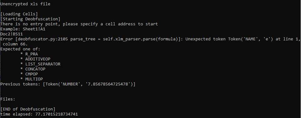 Następnie użyty został program XLMMacroDeobfuscator, także darmowy i otwartoźródłowy program dostępny na stroniehttps://github.com/DissectMalware/XLMMacroDeobfuscator