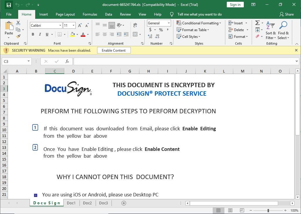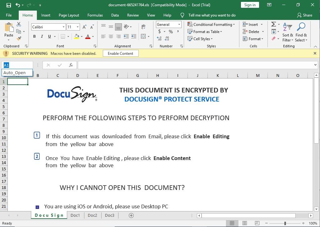 W tym przypadku dokument udaje, że jest zaszyfrowany przez "DocuSign Protect Service".