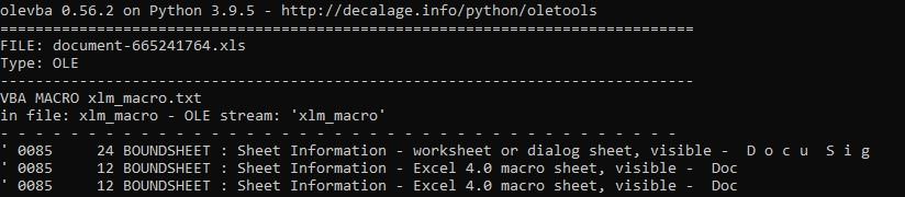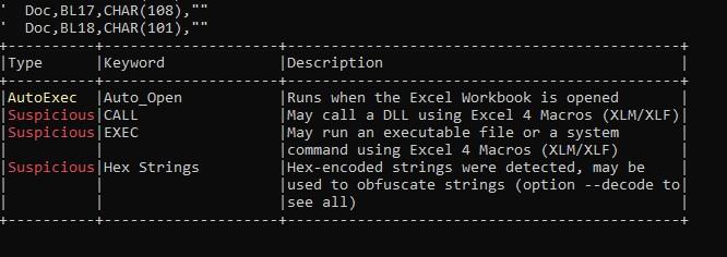 Narzędzia olevba wskazuje nam, że plik posiada makro XLM 4.0.