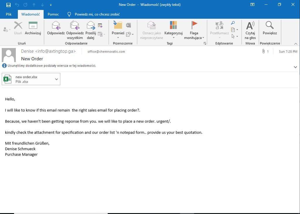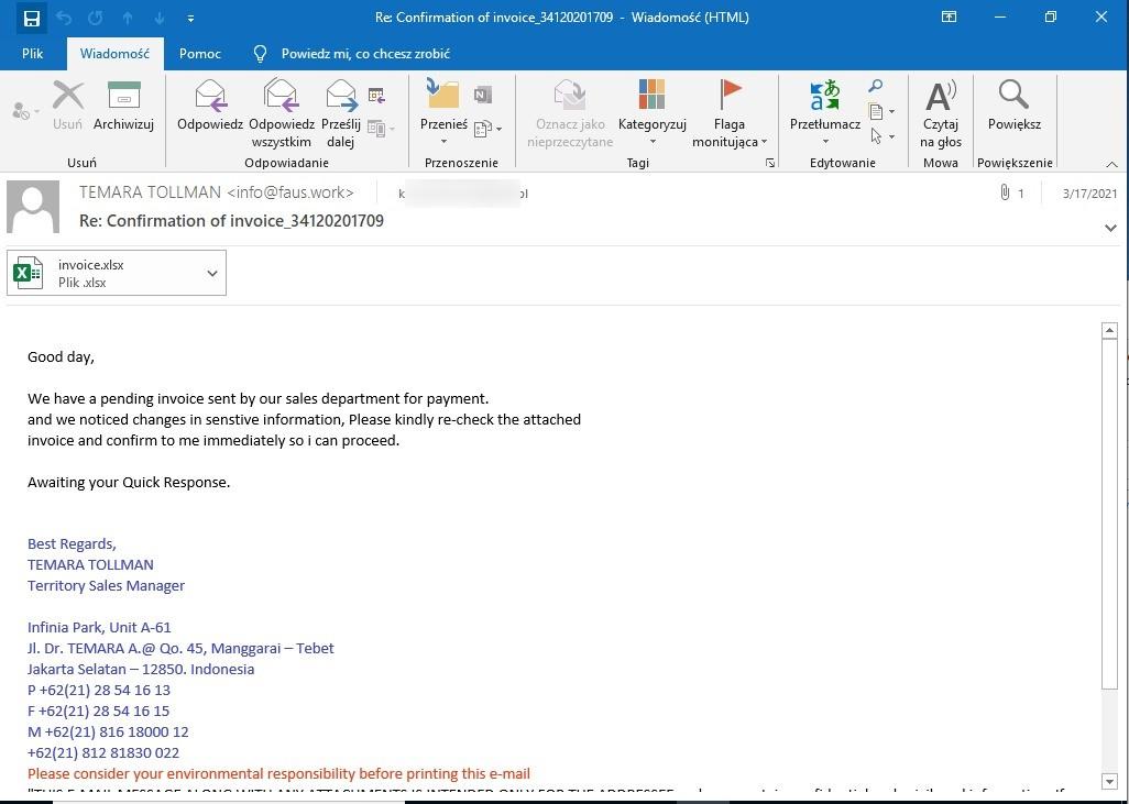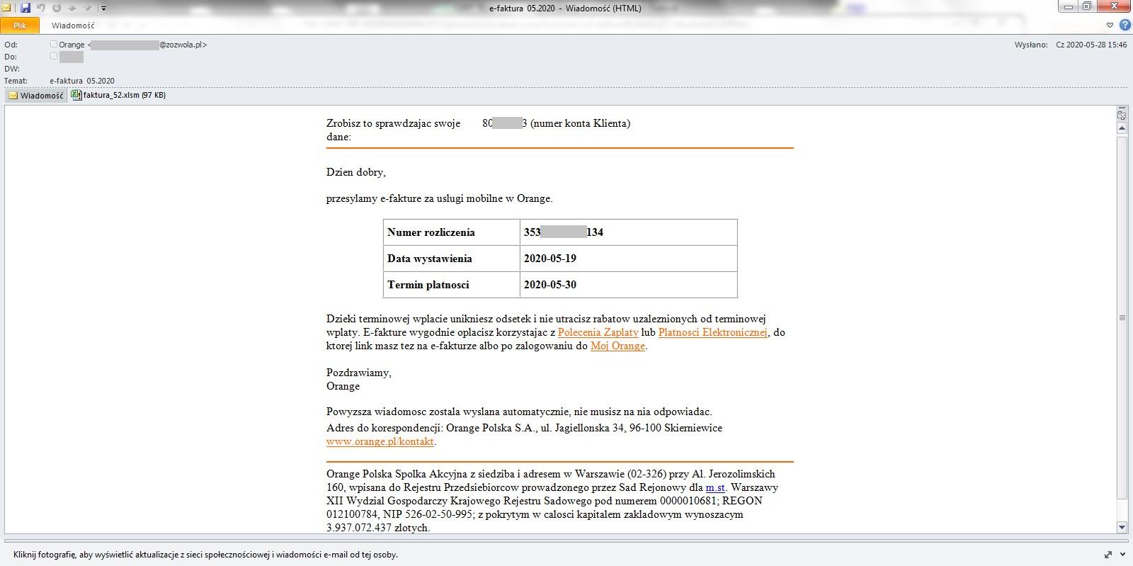 Najczęściej do dystrybucji złośliwego pliku Excel dochodzi bezpośrednio poprzez załącznik wiadomości email – często w tytule lub treści atakujący nawiązuje do wystawionej faktury.