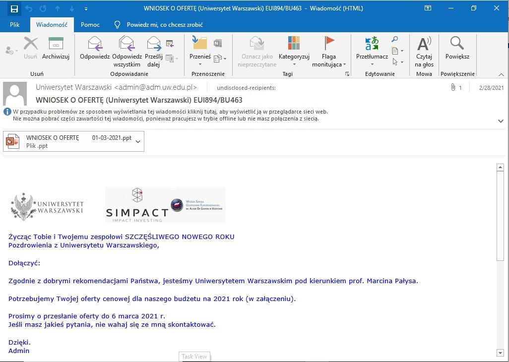 Treść wiadomości mailowej najczęściej ma na celu potwierdzić autentyczność pliku i zachęcić do jego niezwłocznego otwarcia.