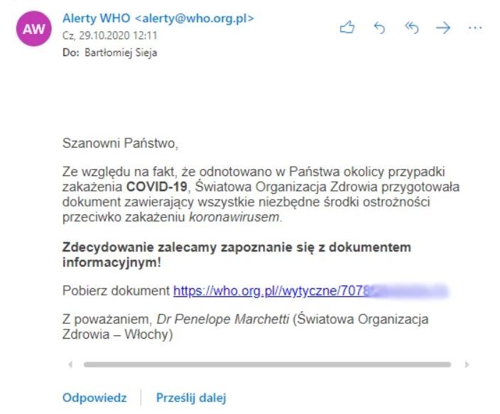 Dokumenty pakietu Office są jedną z głównych metod infekcji i dystrybucji złośliwego oprogramowania. Cyberprzestępcy najczęściej wysyłają złośliwy plik Office bezpośrednio w wiadomości e-mail lub poprzez chmurę – udostępniając link do jego pobrania. W wiadomości podszywają się pod dostawcę usług bankowych, telekomunikacyjnych lub dystrybutora mediów czy nawet agencje rządowe. W 2020 roku zaobserwowaliśmy kampanie mailowe podszywające się między innymi pod Play, Orange, polskie uniwersytety, dostawców energii elektrycznej, a nawet WHO.