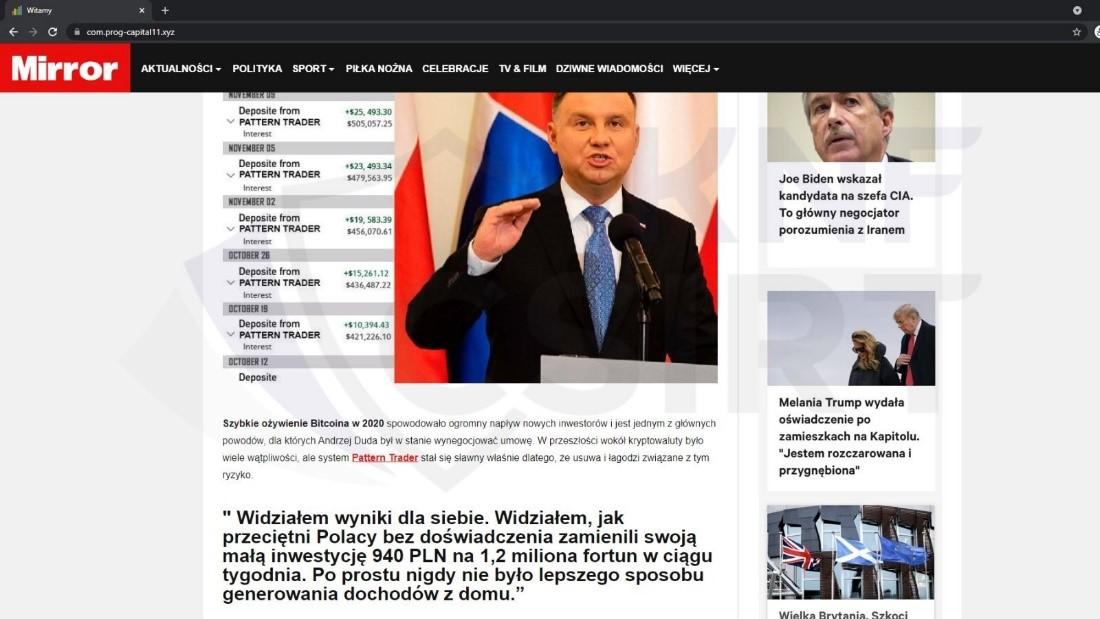 Do nadania inwestycji wiarygodności, przestępstwa zaczynały się od fałszywego artykułu, który był wyświetlany na spreparowanych portalach informacyjnych.