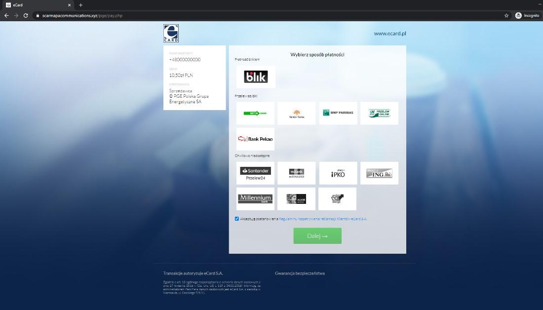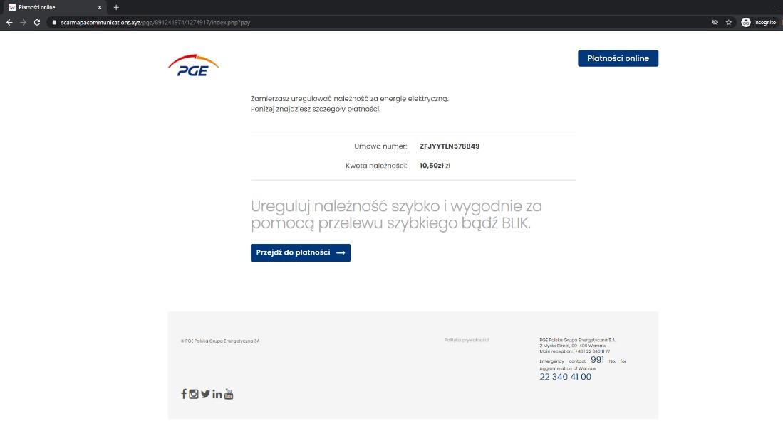 Kolejnym oszustwem na dużą skale okazały się wiadomości SMS z linkiem prowadzącym do fałszywej opłaty za energię elektryczną (PGE). Przestępcy podstawiając fałszywą bramkę płatności z niską kwotą “dopłaty” do rachunku liczą na przechwycenie danych do kart płatniczych podczas wykonywania podstępnej transakcji.