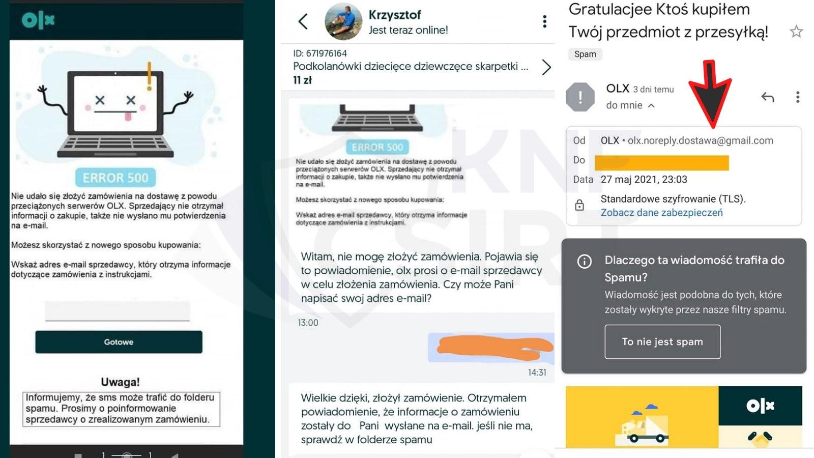 Dalej niechlubnym liderem oszustw pozostaje – oszustwo ‘na kupującego’ w serwisie OLX. Wektory ataku pozostają prawie niezmienne w porównaniu z poprzednim kwartałem. Do podchwytliwych wiadomości na Whatsapp doszły spreparowane grafiki mówiące o błędach (ERROR 500) w serwisie OLX, co zmusza sprzedającego opuścić konwersację wewnątrz portalu I przenieść się do wyżej wspomnianej aplikacji aby “sfinalizować” sprzedaż.