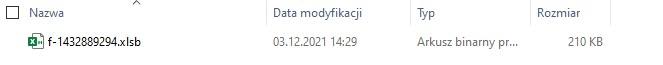 Przy każdorazowym pobraniu, nawet z tego samego adresu URL, możemy otrzymać plik o innej sumie kontrolnej, co skutecznie utrudnia wykrywanie oparte o sygnatury.W każdym archiwum znajduje się jeden plik formatu Microsoft Excel z rozszerzeniem .xlsb.