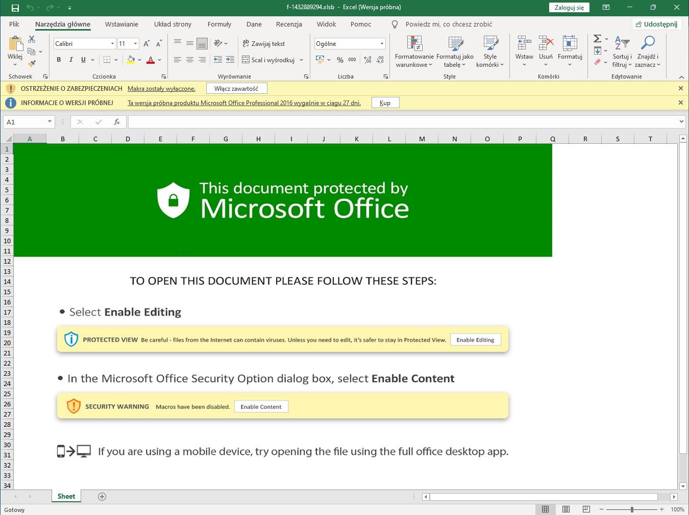 Otwarcie dokumentu skutkuje wyświetleniem elementu graficznego, którego zadaniem jest przekonanie użytkownika o zabezpieczeniu pliku przez Microsoft Office. Aby wyświetlić pełną treść dokumentu, potencjalna ofiara musi włączyć obsługę makr.