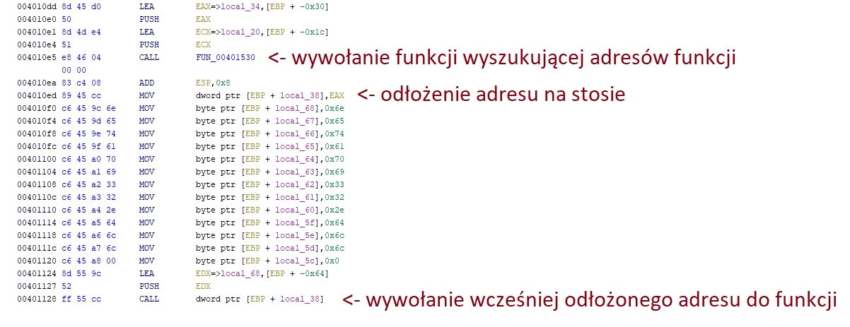 Każda z funkcji przed rozpoczęciem właściwego działania wyszukuje adres funkcji z bibliotek DLL za pomocą dedykowanej funkcji 0x00401530 przyjmującej 2 parametry - nazwę biblioteki DLL oraz nazwę szukanej funkcji.