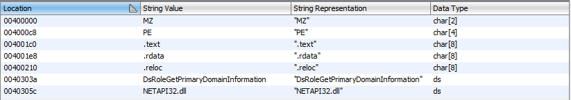 Na zrzucie ekranu zauważalna jest zastanawiająco mała lista importów – widoczna jest tylko jedna biblioteka i tylko jedna funkcja. Warto zauważyć, że w trakcie analizy wykryta została bardzo mała ilość łańcuchów znakowych.