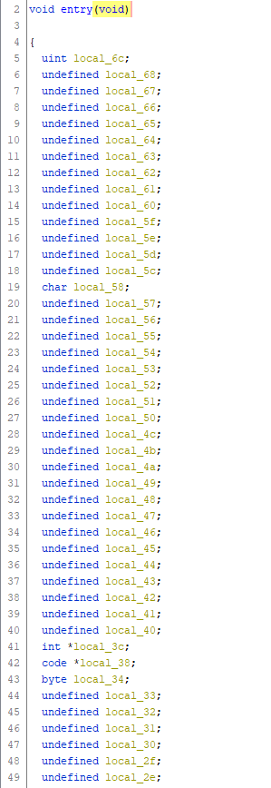 Widoczna jest duża ilość zmiennych lokalnych, z których część już na samym początku jest inicjalizowana jednobajtowymi wartościami.