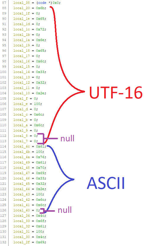 Dodatkowo, wszystkie potrzebne biblioteki są ładowane na początku funkcji entry i wywołania LoadLibraryA