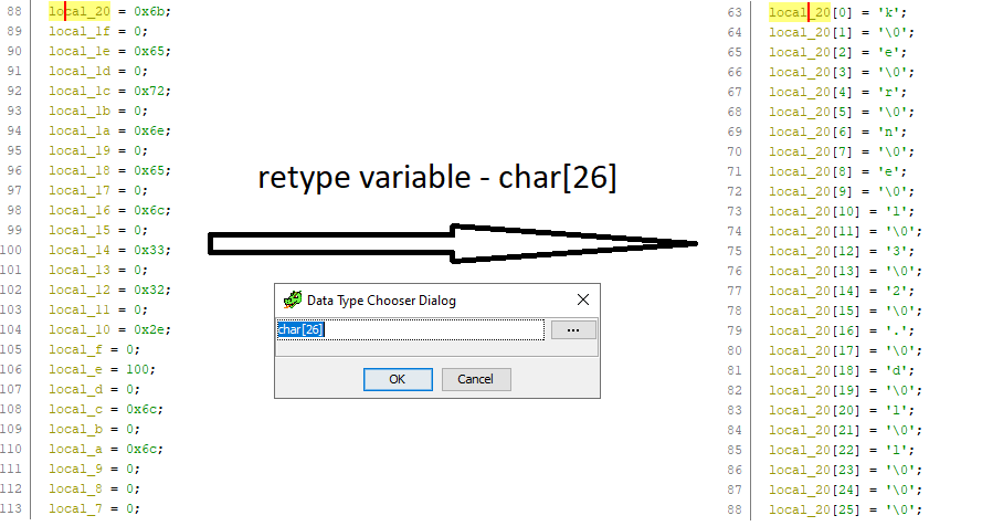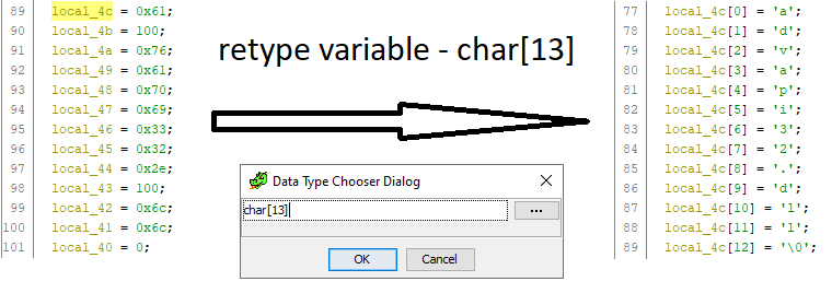 W celu ułatwienia analizy (w tym przypadku w programie Ghidra) możemy zmienić typ pierwszego znaku w ciągu na tablicę znaków odpowiadającą jej długości przy użyciu opcji retype variable. Dzięki temu prostemu zabiegowi kod staje się dużo czytelniejszy.