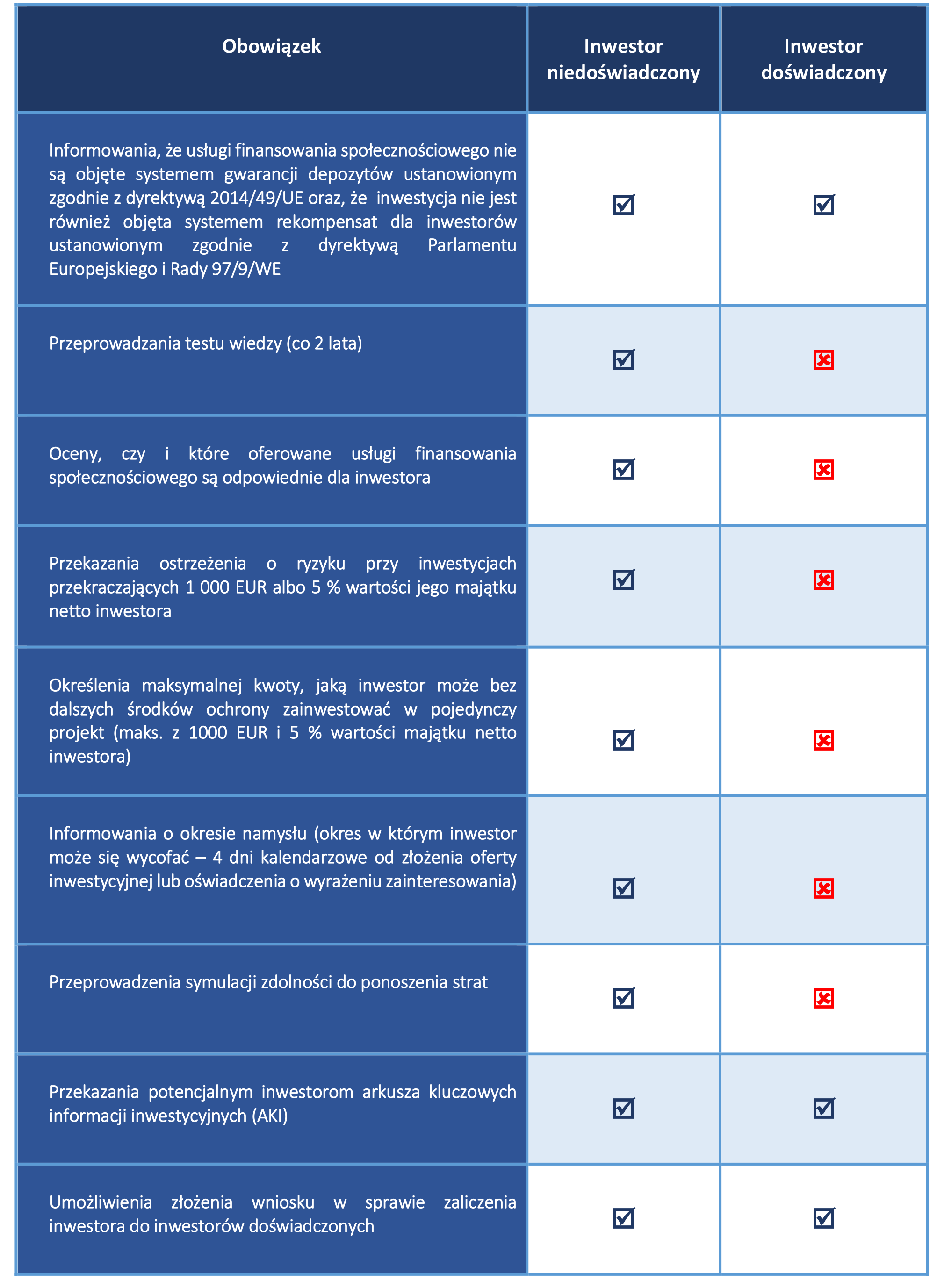 Platforma crowdfundingowa pożyczkowa zobowiązana jest do ochrony inwestorów - w szczególności do rozróżnienia między inwestorami doświadczonymi i inwestorami niedoświadczonymi.