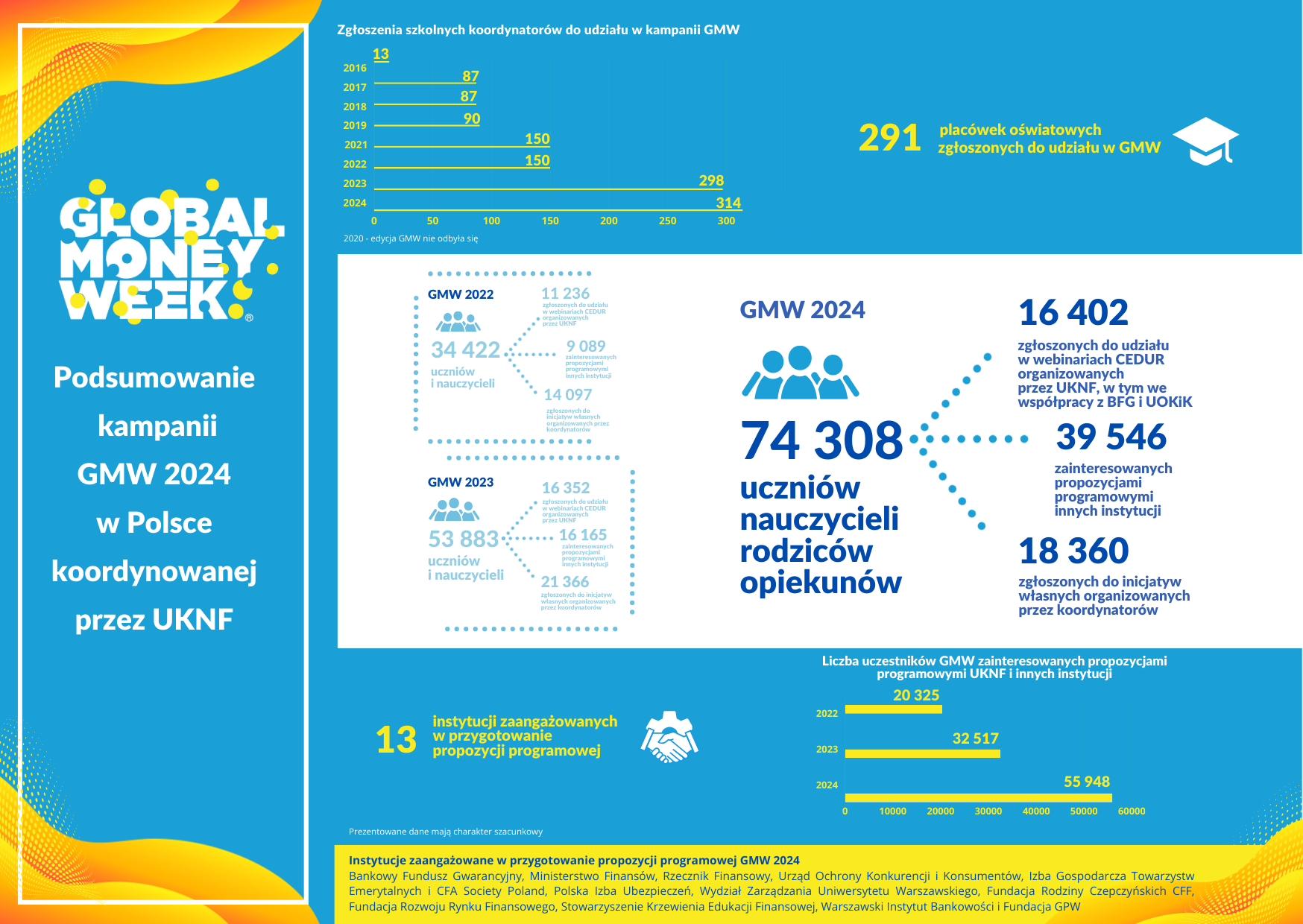 12. edycja międzynarodowej kampanii Global Money Week (GMW) odbyła się pomiędzy 18 a 24 marca 2024 roku pod hasłem „Zabezpiecz swoje pieniądze i swoją przyszłość" (Protect your money, secure your future). Do udziału w koordynowanej przez UKNF krajowej edycji GMW zgłosiło się ponad 74 tys. uczestników, w tym przede wszystkim dzieci i młodzież szkolna, ale także nauczyciele oraz rodzice i opiekunowie.